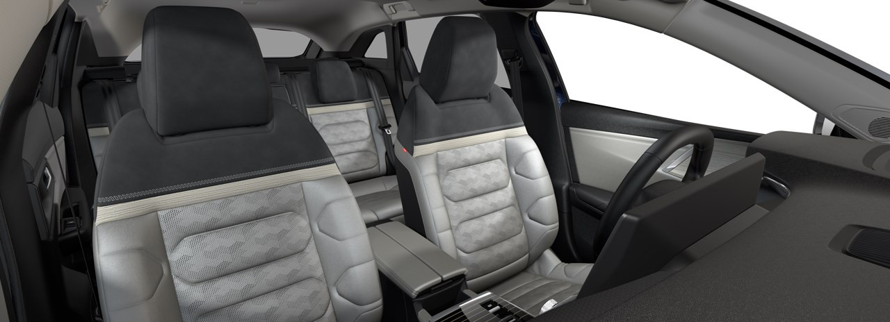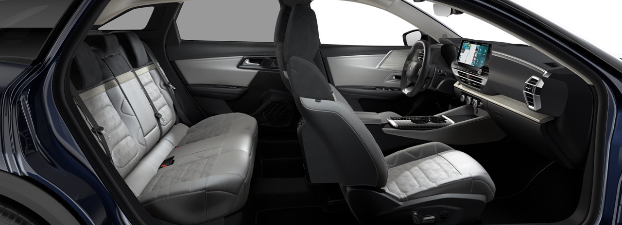 Interieur: Bekleding leder/alcantara ‘Hype Hypnos’ (grijs/zwart gecombineerd met ‘Eiffel Grey’ band en ‘Graphite Grey’ accentstiksles)